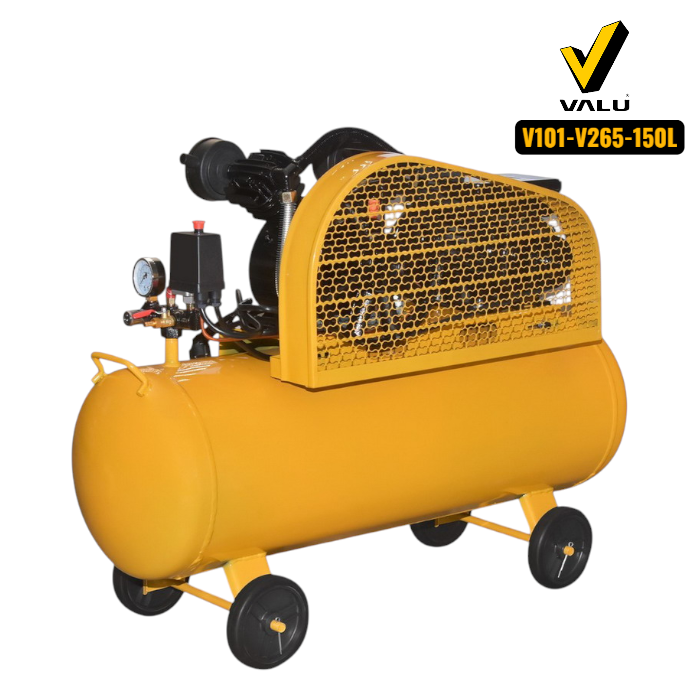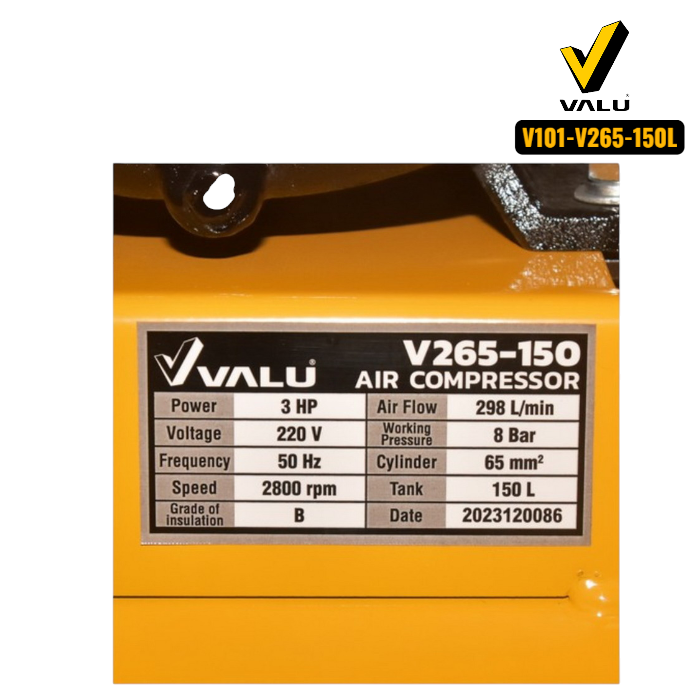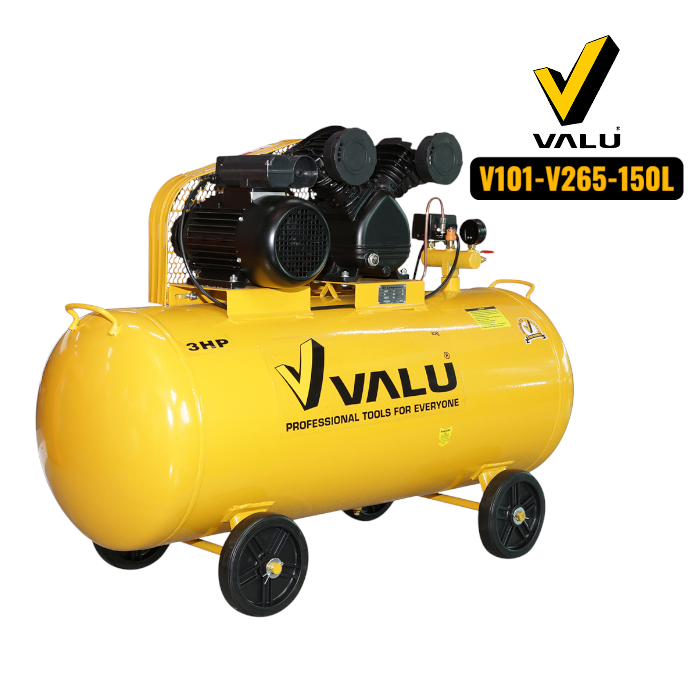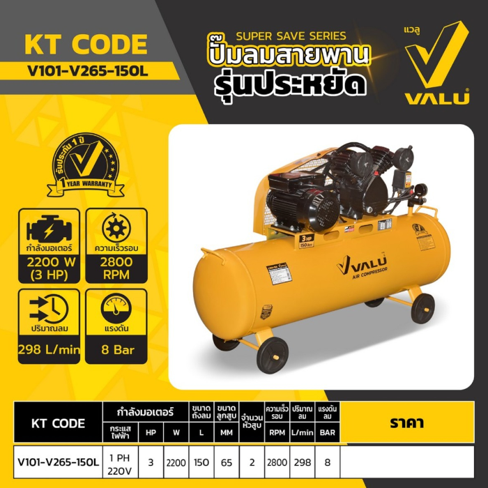 VALU ปั๊มลมสายพาน 2 หัว มอเตอร์ 3 แรงม้า (2200 วัตต์) ถัง 150 ลิตร รุ่น 265-150 ไฟ 1 เฟส ความเร็วรอบ 2800 รอบ/นาที แรงดันลม 8 บาร์ ปริมาณลม 298 ลิตร/นาที (แวลู)